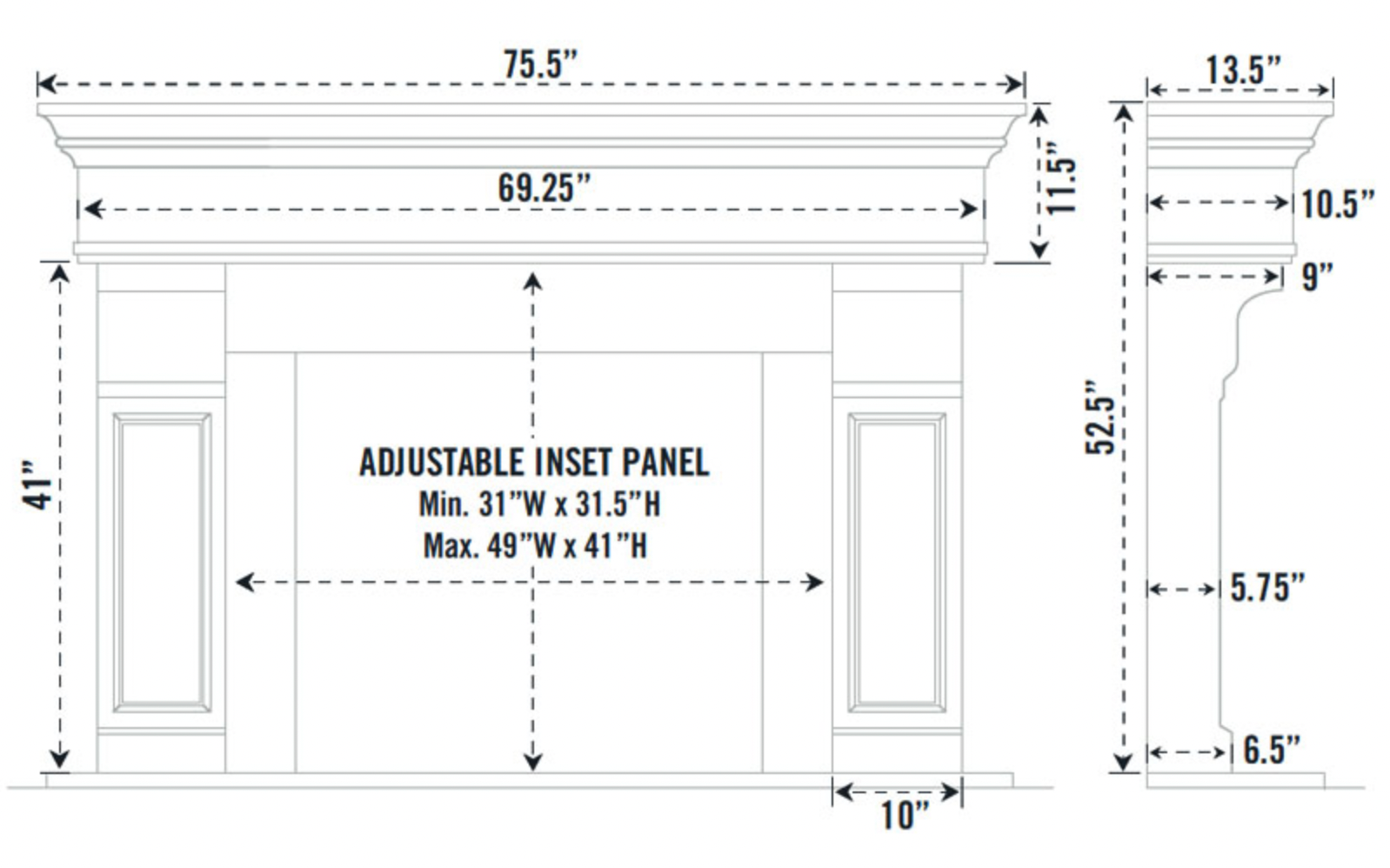 This mantel comes as shown in the dimension picture. However, our product can be customized to different sizes and finishes on demand. This mantel is only the tip of the iceberg of what Omega Mantels can create for you, we can adapt to every project. Our job is to assist you with the design to match your dream ideas to your existent wall.